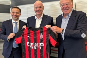 国际足联主席因凡蒂诺造访米兰总部,并与米兰高层合影