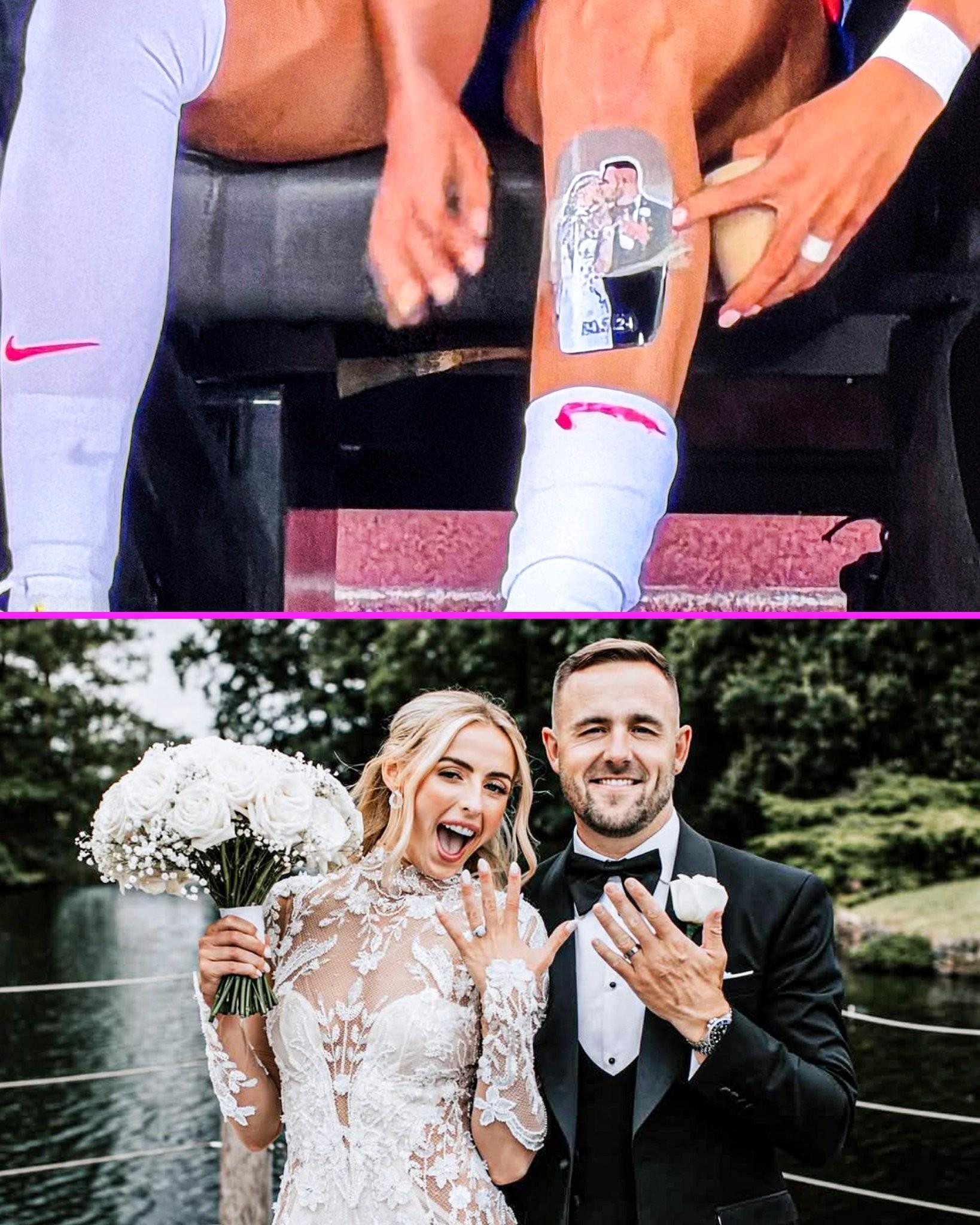 浪漫,英格兰女足凯利护腿板上印着她和丈夫婚礼上接吻的画面